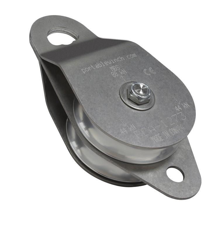 Pour les charges plus lourdes, vous pouvez multiplier la puissance de tire en utilisant des poulies. Cette poulie double est faite des mêmes matériaux que la poulie simple (PCA-1274) mais avec deux poulies de 100 mm (4'') de diamètre. Avec une poulie double attachée à la charge et une poulie simple attachée à un ancrage, vous triplez la force de tire. Avec deux poulies double, une force surprenante de 4 tonnes est offerte (en utilisant le treuil PCW5000)!