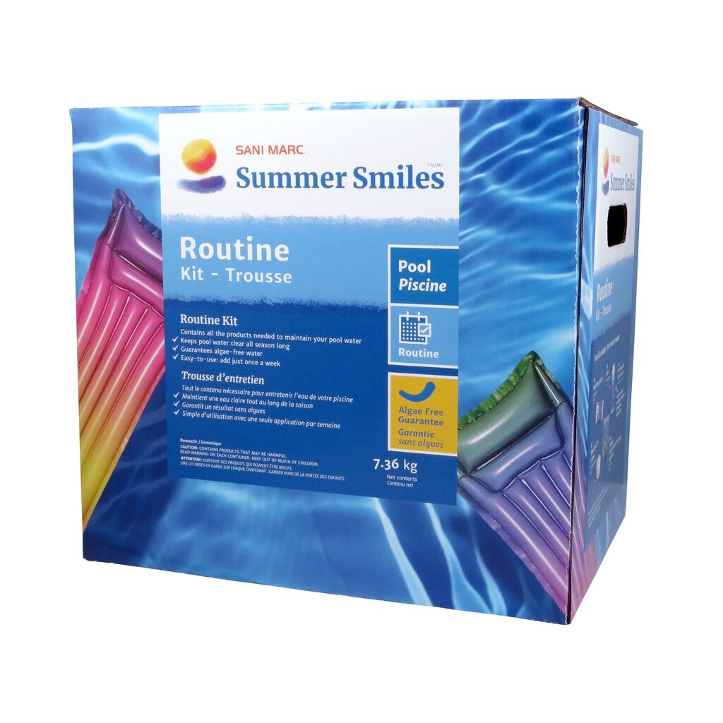 - La TROUSSE ROUTINE Summer Smiles vous aidera à maintenir l’équilibre et la clarté de l’eau de votre piscine tout au long de la saison. Cette trousse vous garantit un résultat sans algues!