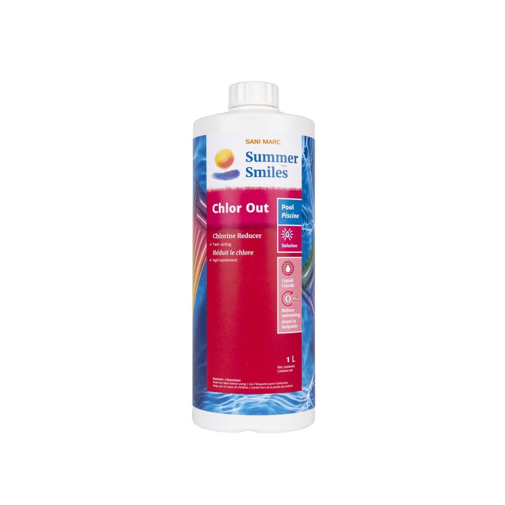 - CHLOR OUT réduit rapidement le taux de chlore dans votre piscine afin de permettre aux baigneurs de profiter immédiatement de la piscine. CHLOR OUT ne changera pas les couleurs du vinyle, du ciment et des piscines en fibre de verre.