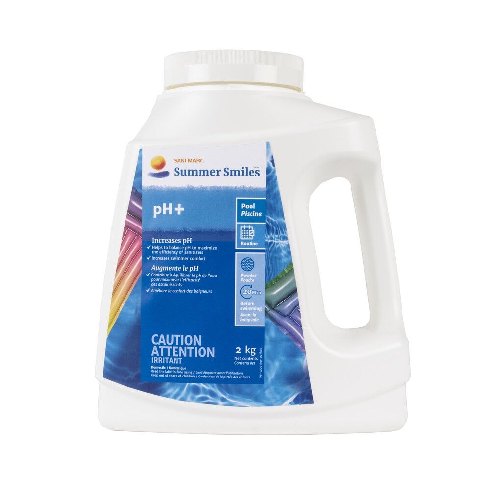 - pH+ aide à augmenter le pH pour obtenir le maximum d’efficacité des assainissants et éviter la corrosion des surfaces. Le maintien d’un pH équilibré assure le confort des baigneurs et la protection des équipements de piscine. pH+ augmente également le taux d’alcalinité dans l’eau.