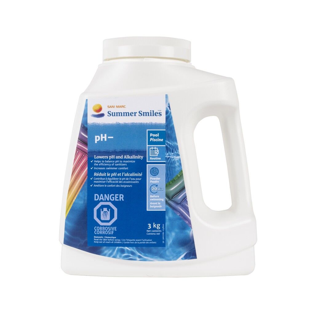 • pH- aide à réduire le pH pour obtenir le maximum d’efficacité des assainissants et pour éviter les problèmes d’eau brouillée et la formation de tartre. Le maintien d’un pH équilibré assure le confort des baigneurs et la protection des équipements de piscine.